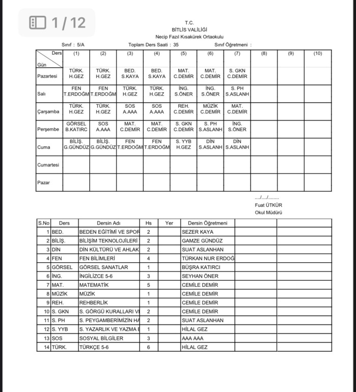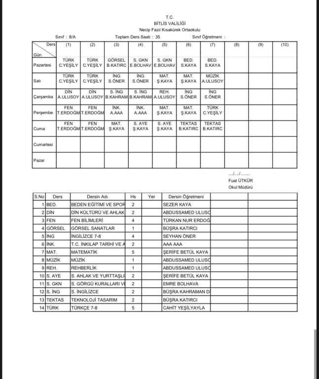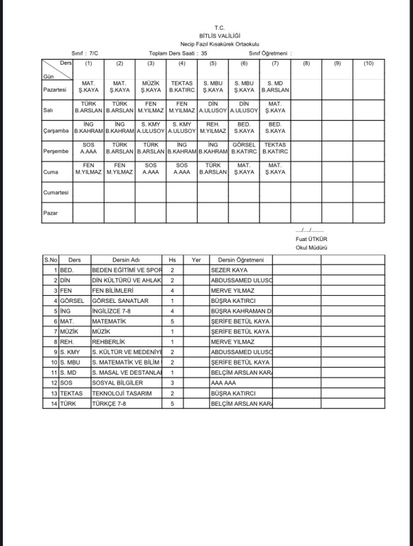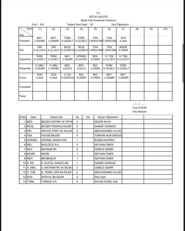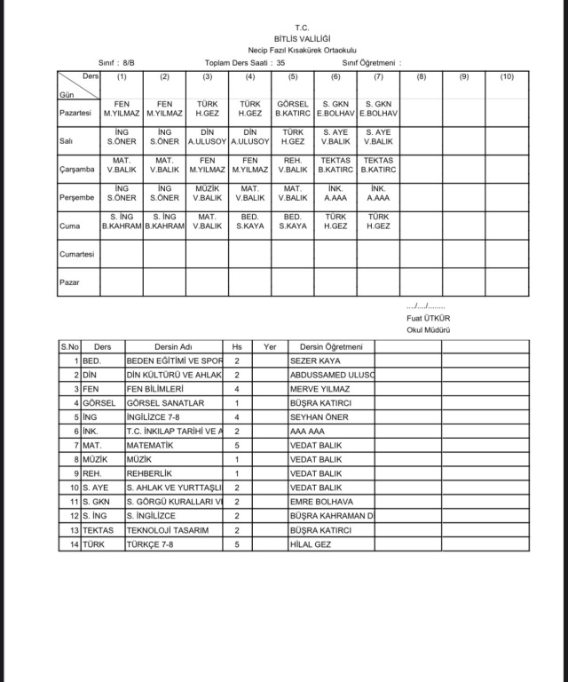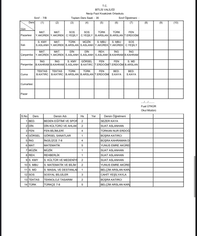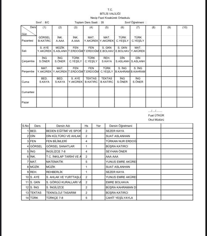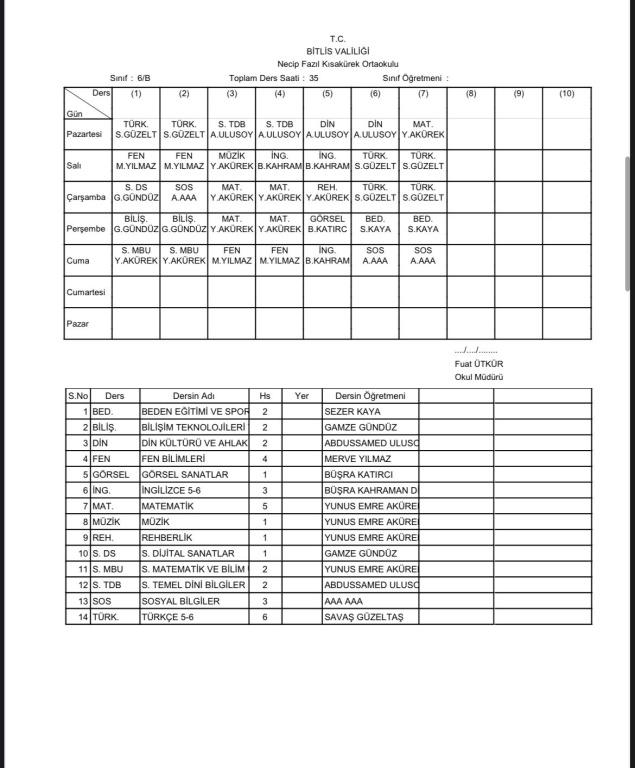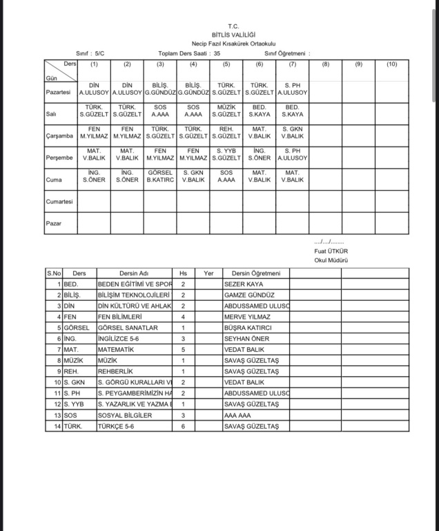 2025-2026 Eğitim Öğretim Yılı 1. Dönem Sınıf Ders Programı